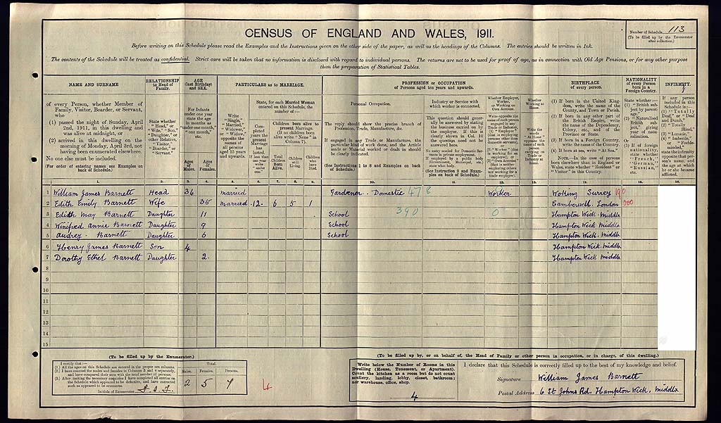1911 Census Schedule # 113